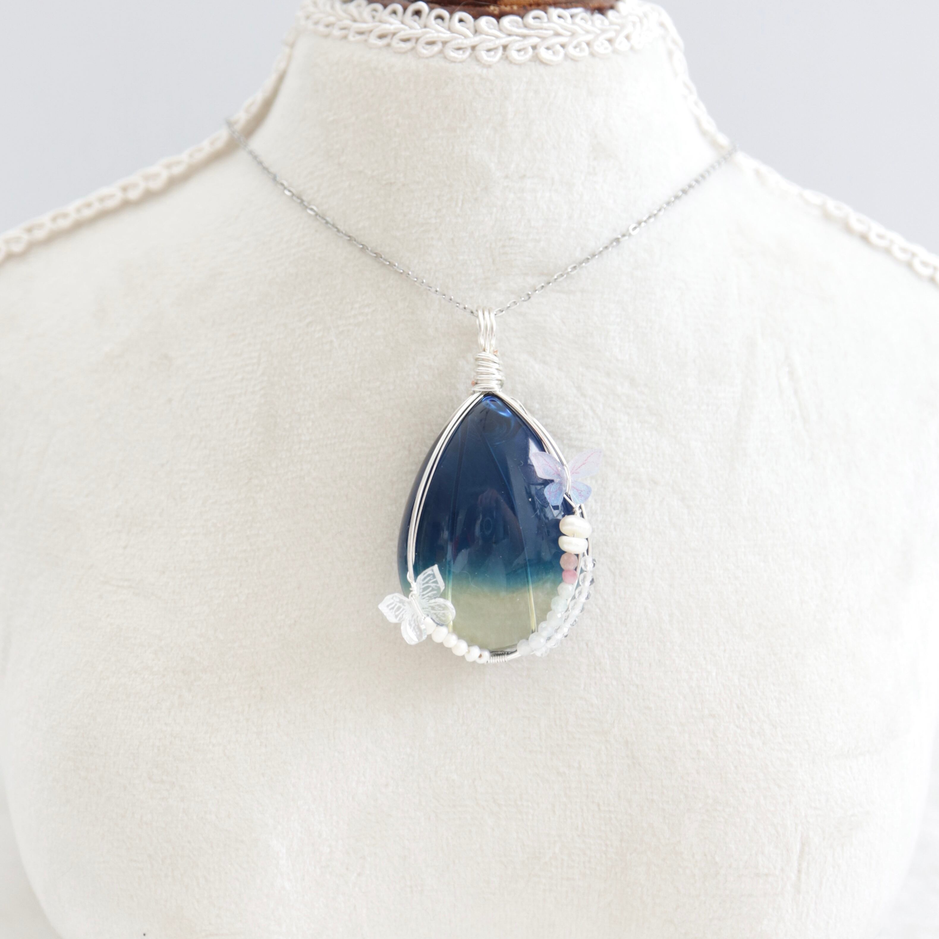 【1点もの】琥珀《蒼の蝶と草木染め》ネックレス&ピアスセット|リトアニア伝統染めの天然石アクセサリー