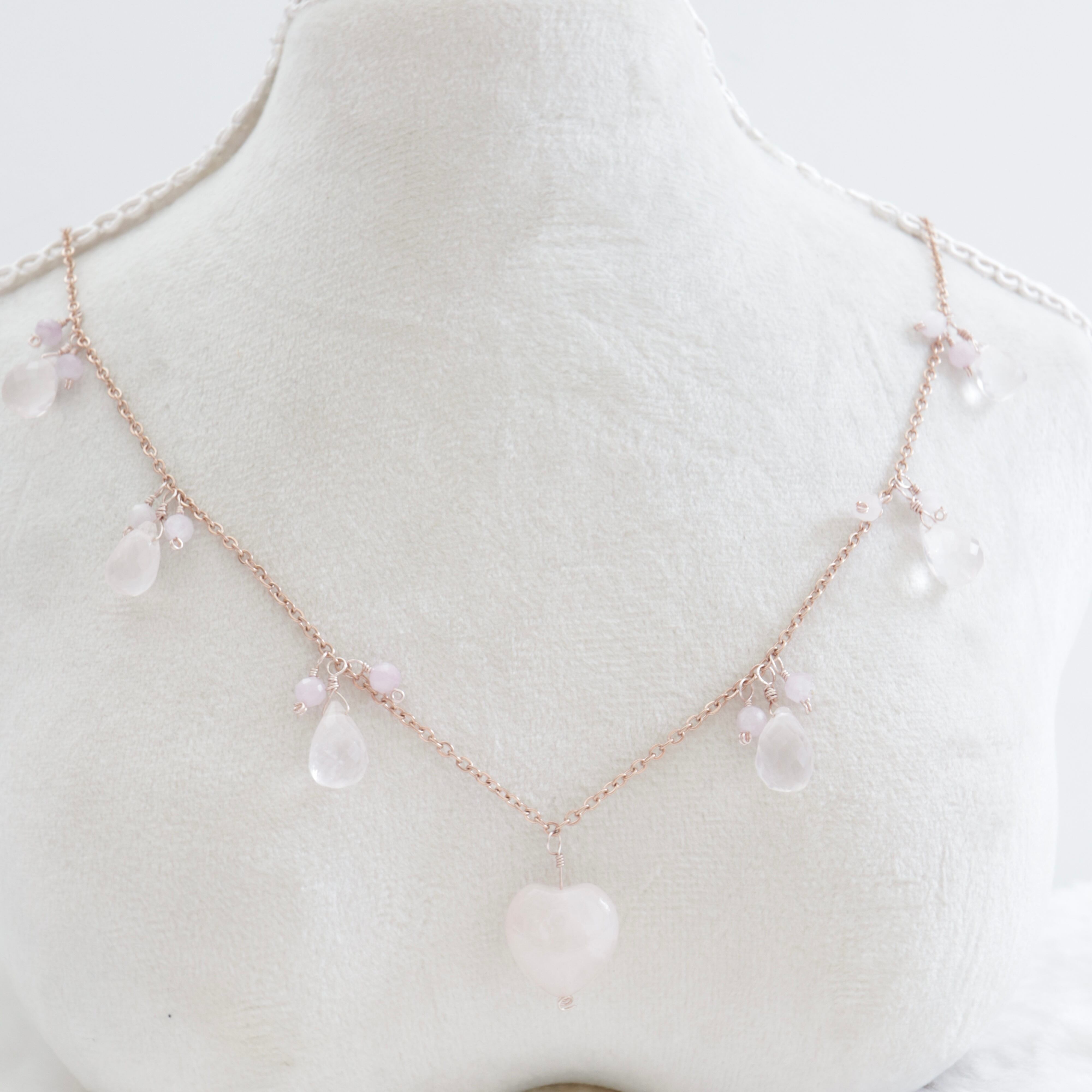 ハート型のモチーフはまさに愛情の象徴。さらに、雫型のローズクォーツを連ねることで、胸元にやわらかなリズムと透明感を生み出しました。