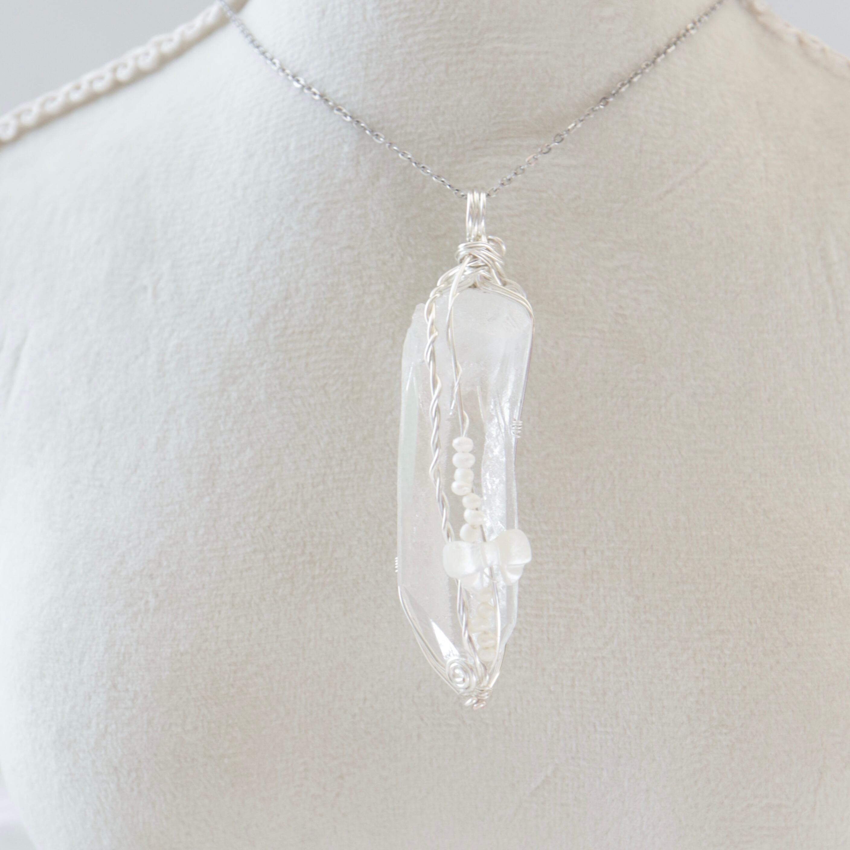 今回のペンダントは、すらりと伸びた結晶をそのまま活かし、清らかな白を基調にワイヤーラップ。