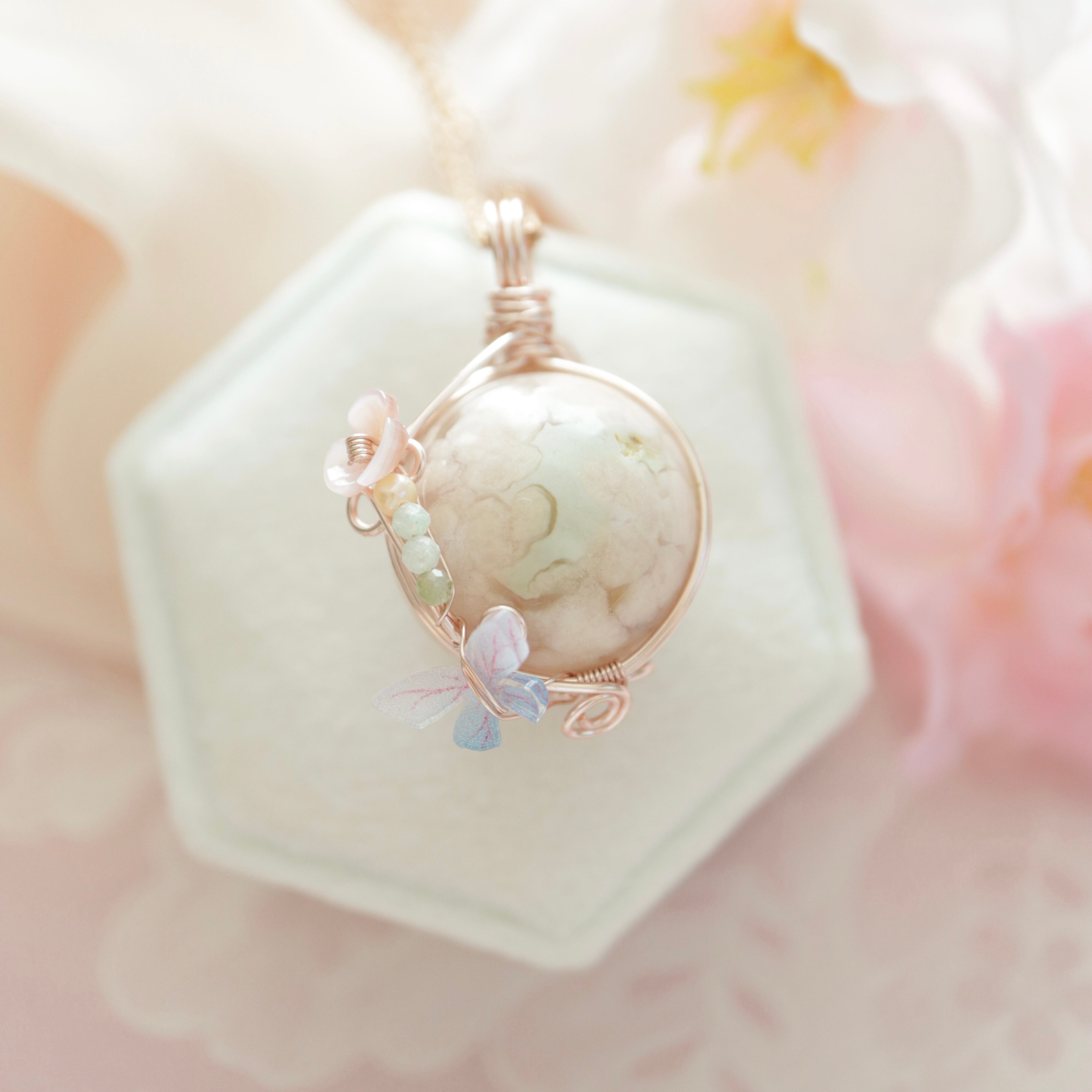 淡い桜色にやわらかな緑を重ねたこのペンダントは、