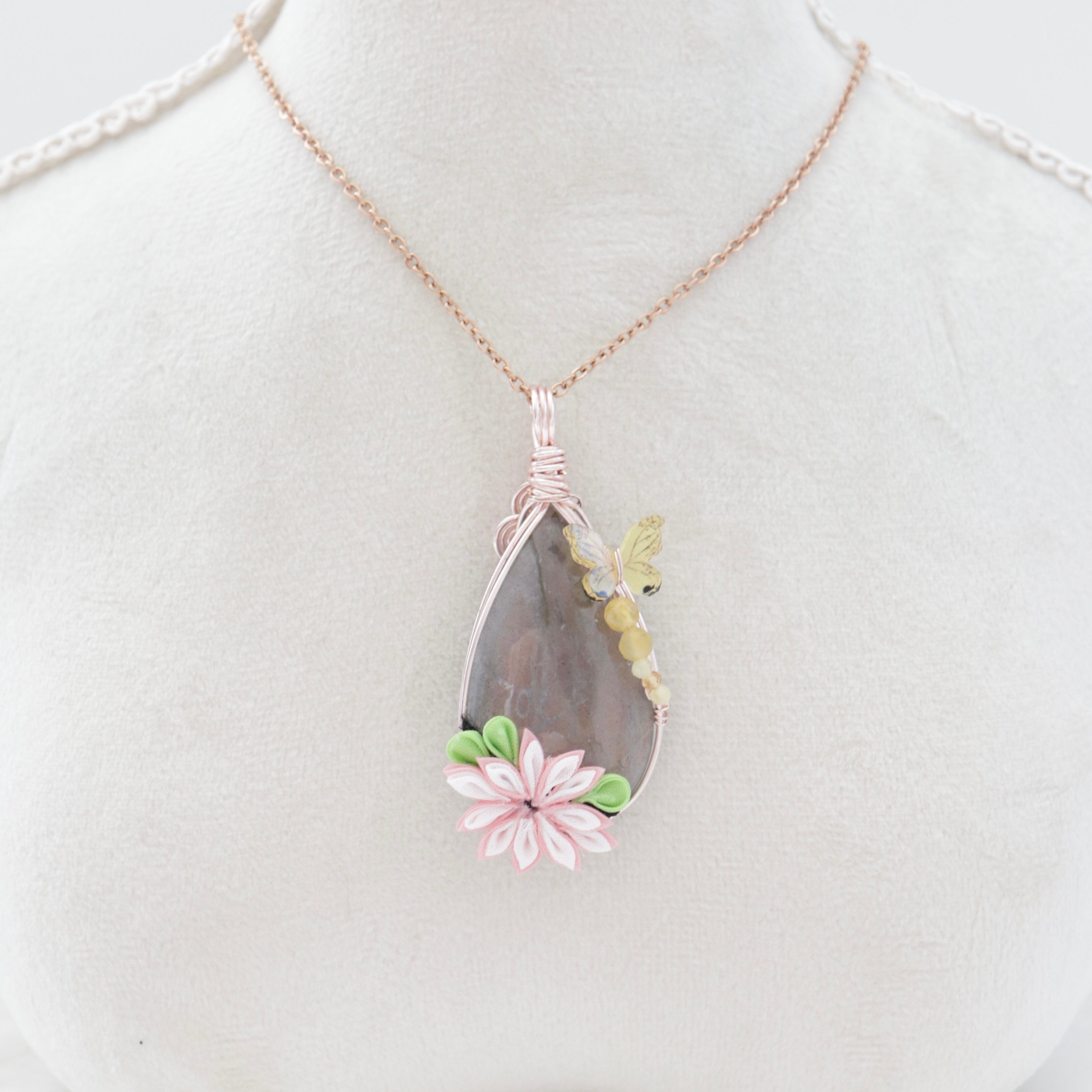 【1点もの】ピンクラブラドライト×つまみ細工《春風に舞う蝶》|天然石アクセサリー