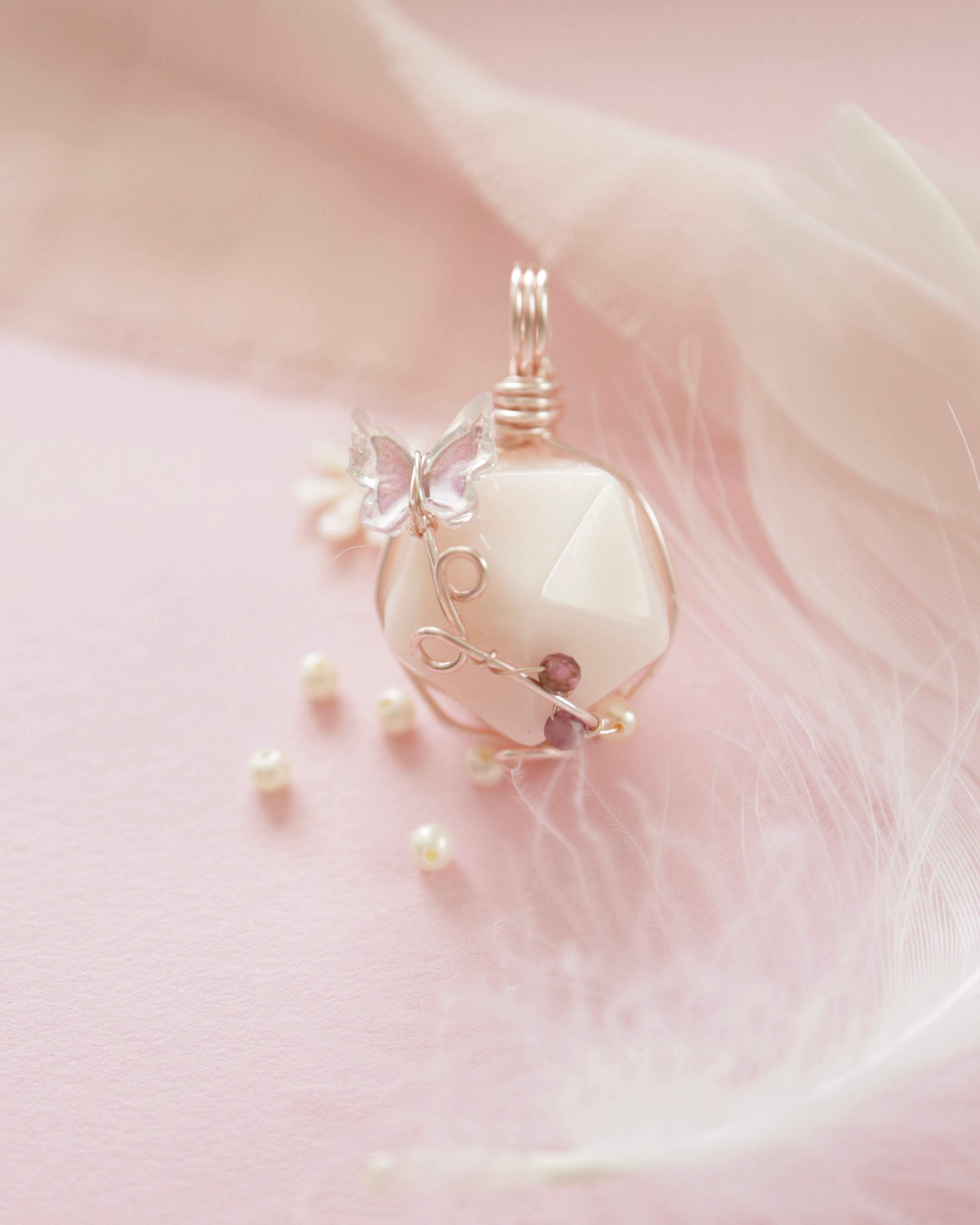 やわらかなミルキーピンクが印象的な、ピンクカルサイトのペンダント。