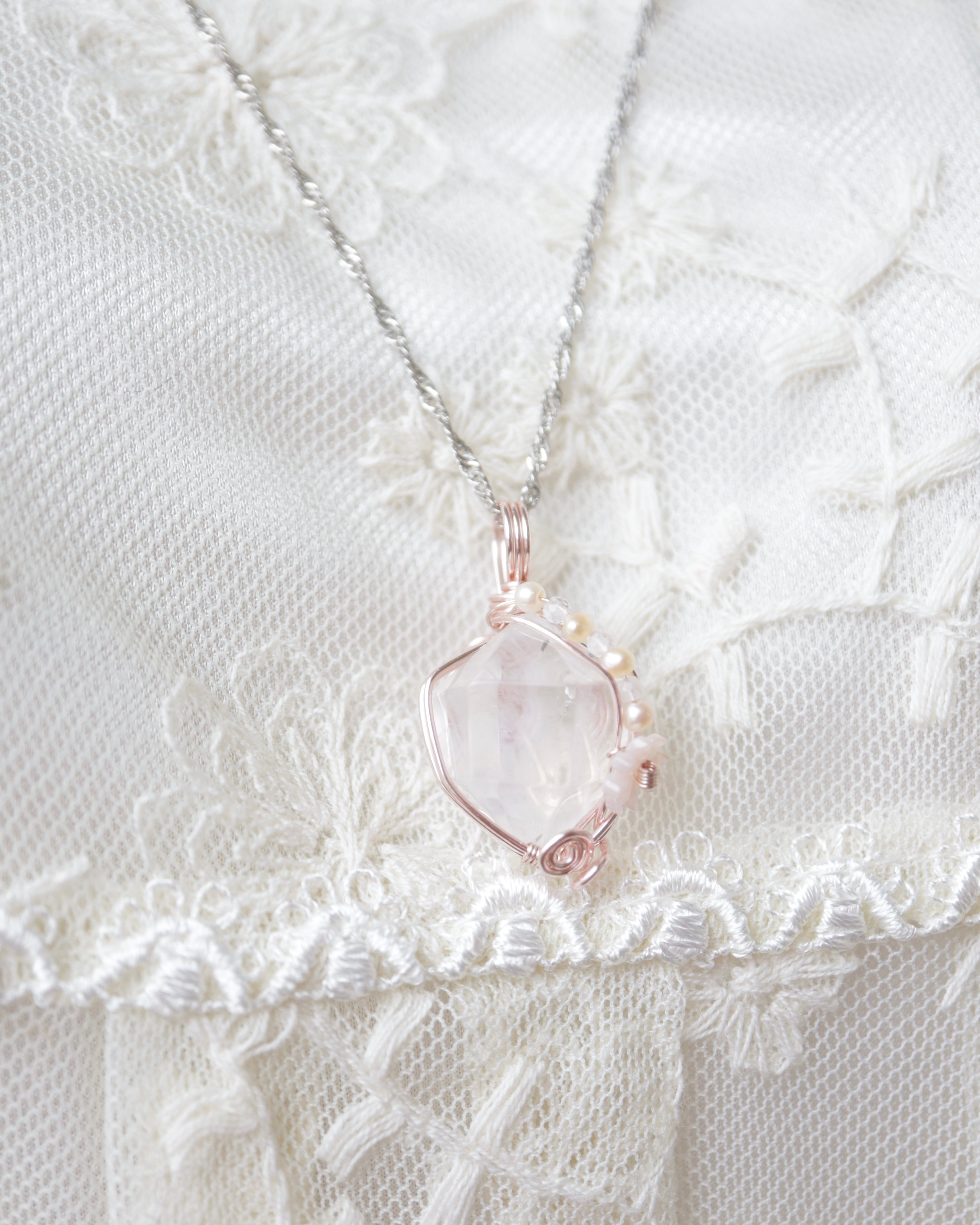 ローズゴールドカラーのワイヤーと、淡い色合いの天然石を添え、