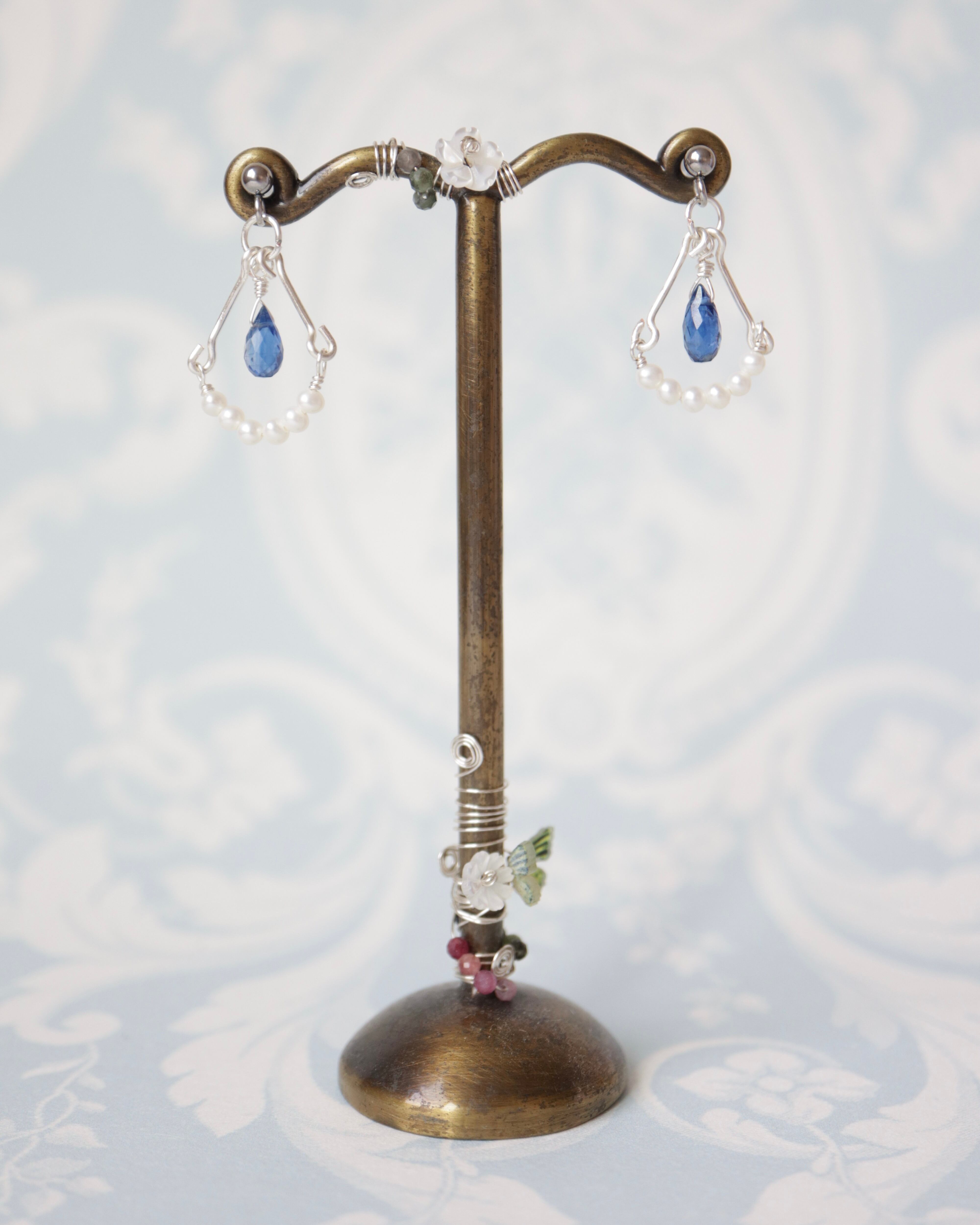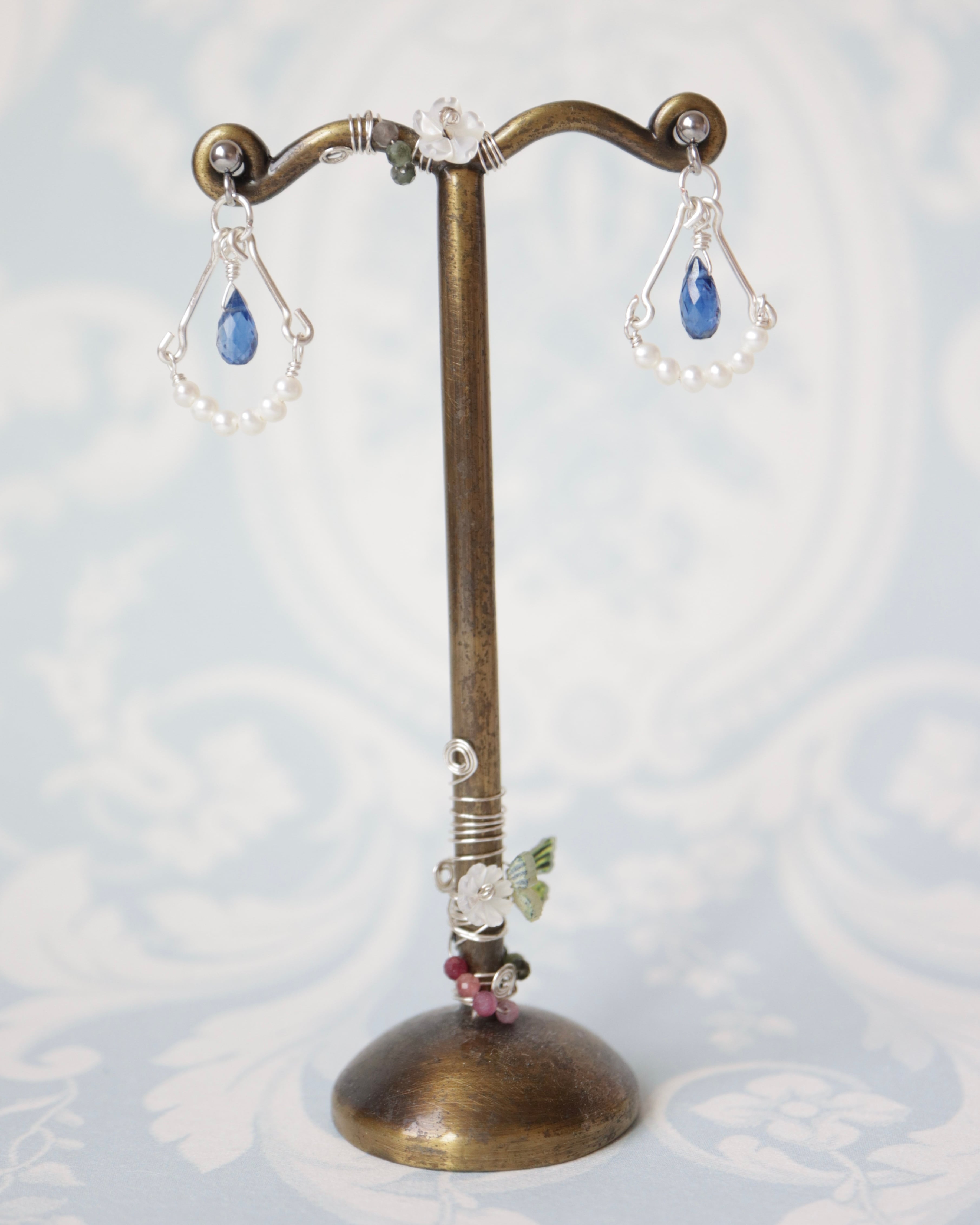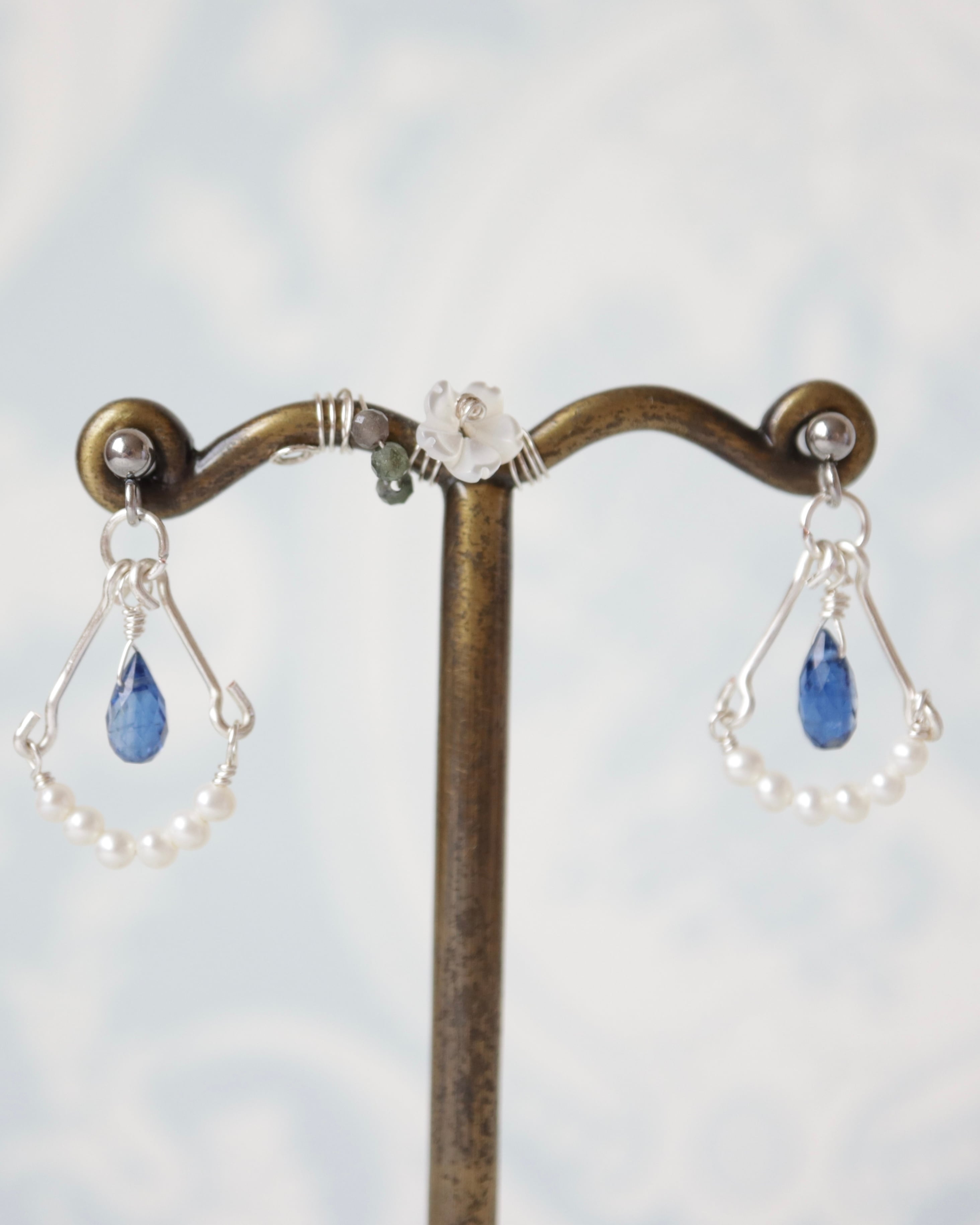 美しいカイヤナイトを主役に、小さな淡水パールを添えたワイヤーアクセサリー。