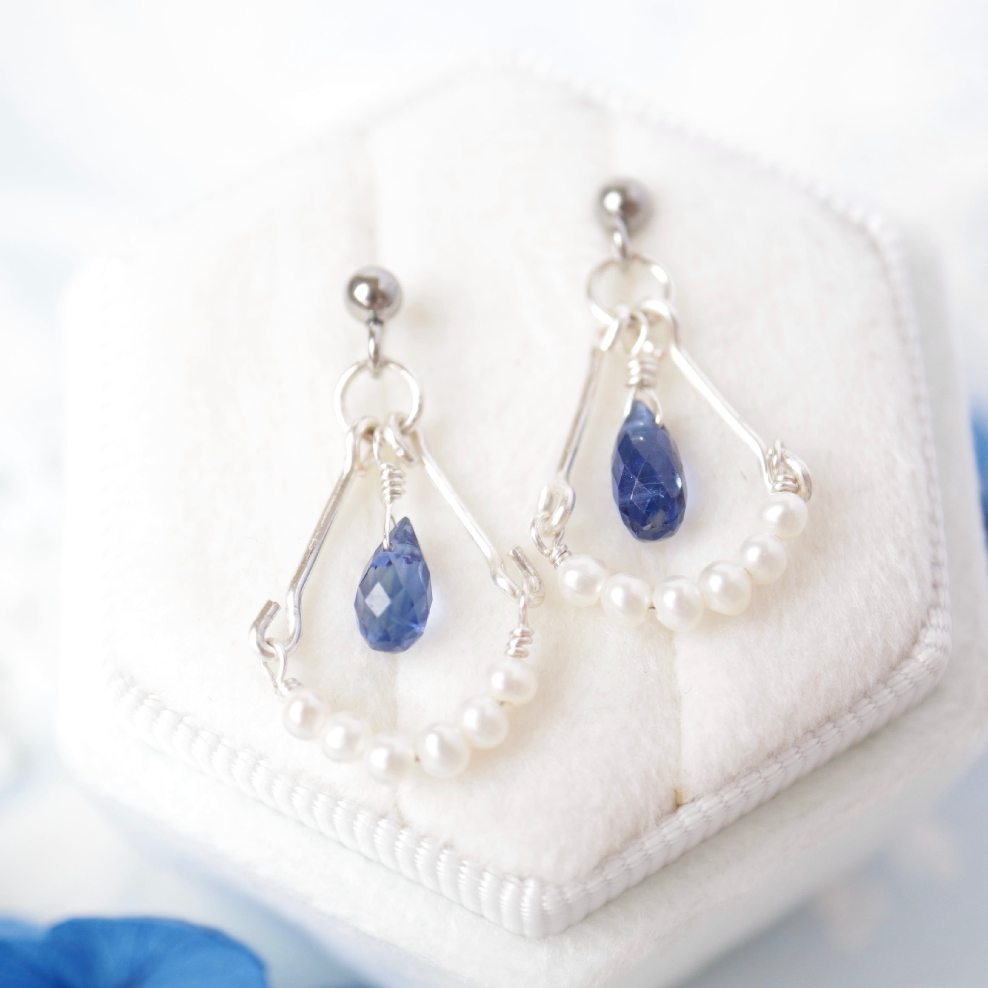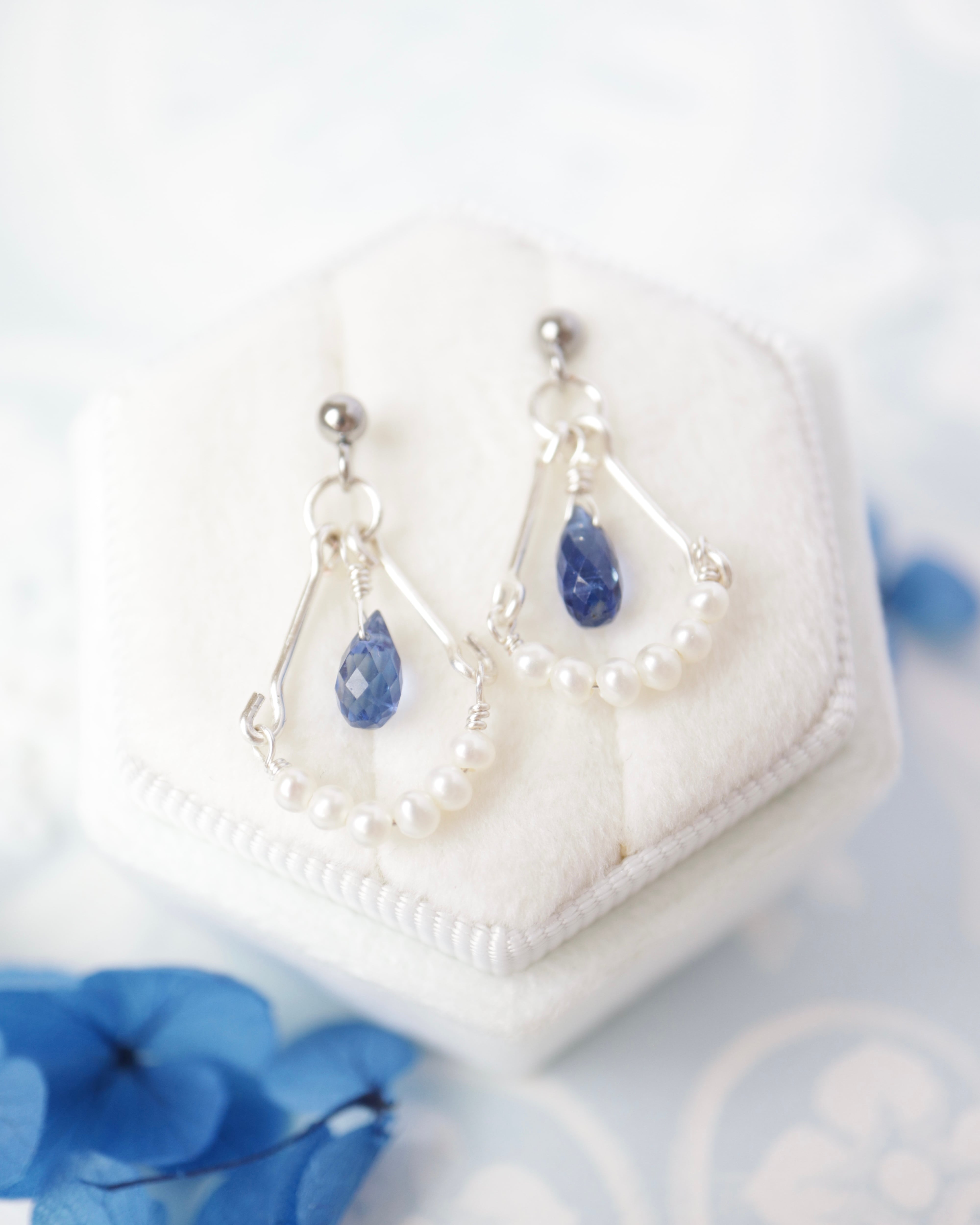シャープな印象の青い雫を、やわらかな光を放つ小さなパールたちで優しく包み込むように、