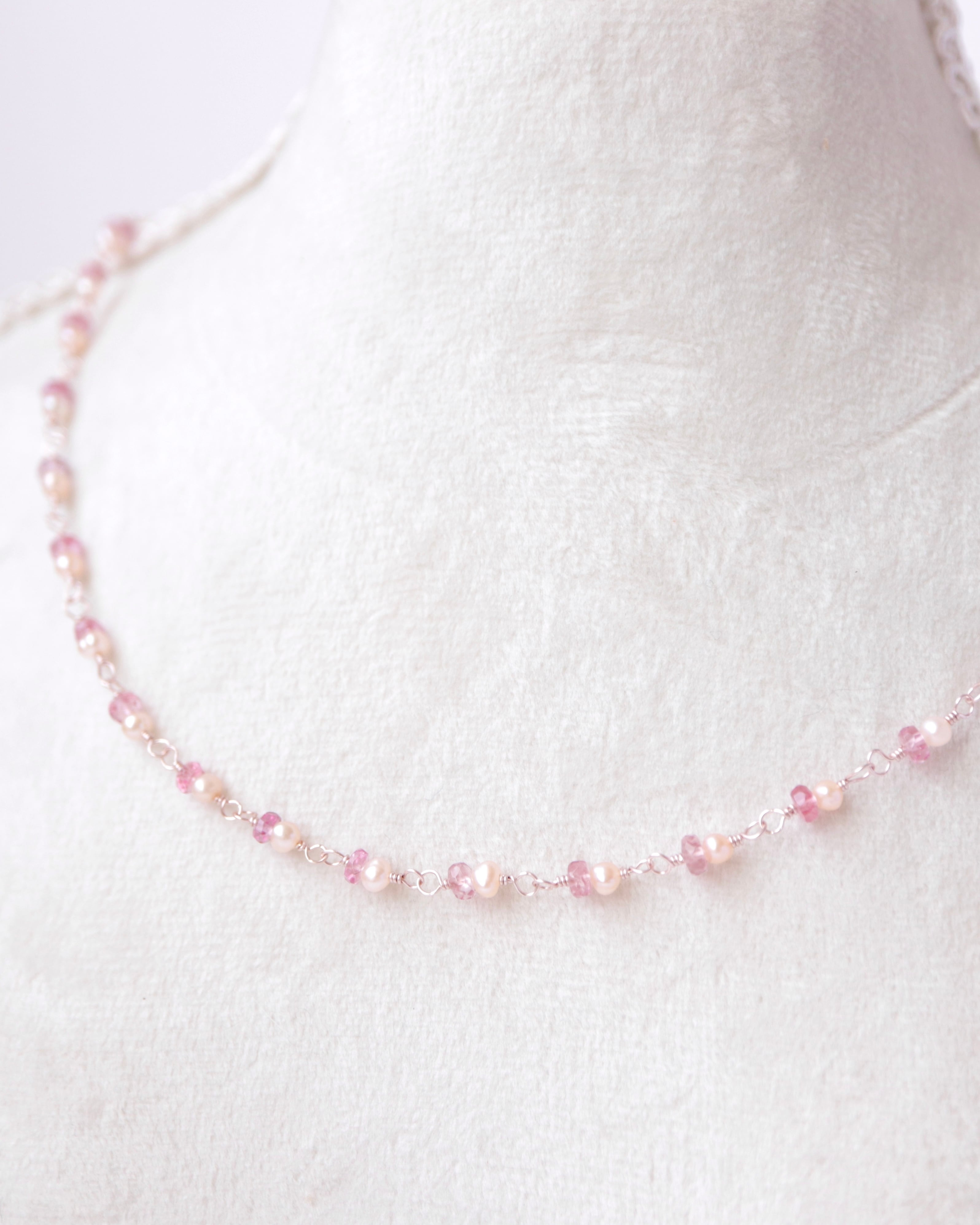 【春を纏う】桜舞う春のきらめき《桜霞(さくらがすみ)》|ピンクトルマリンと淡水パールの華奢見えネックレス