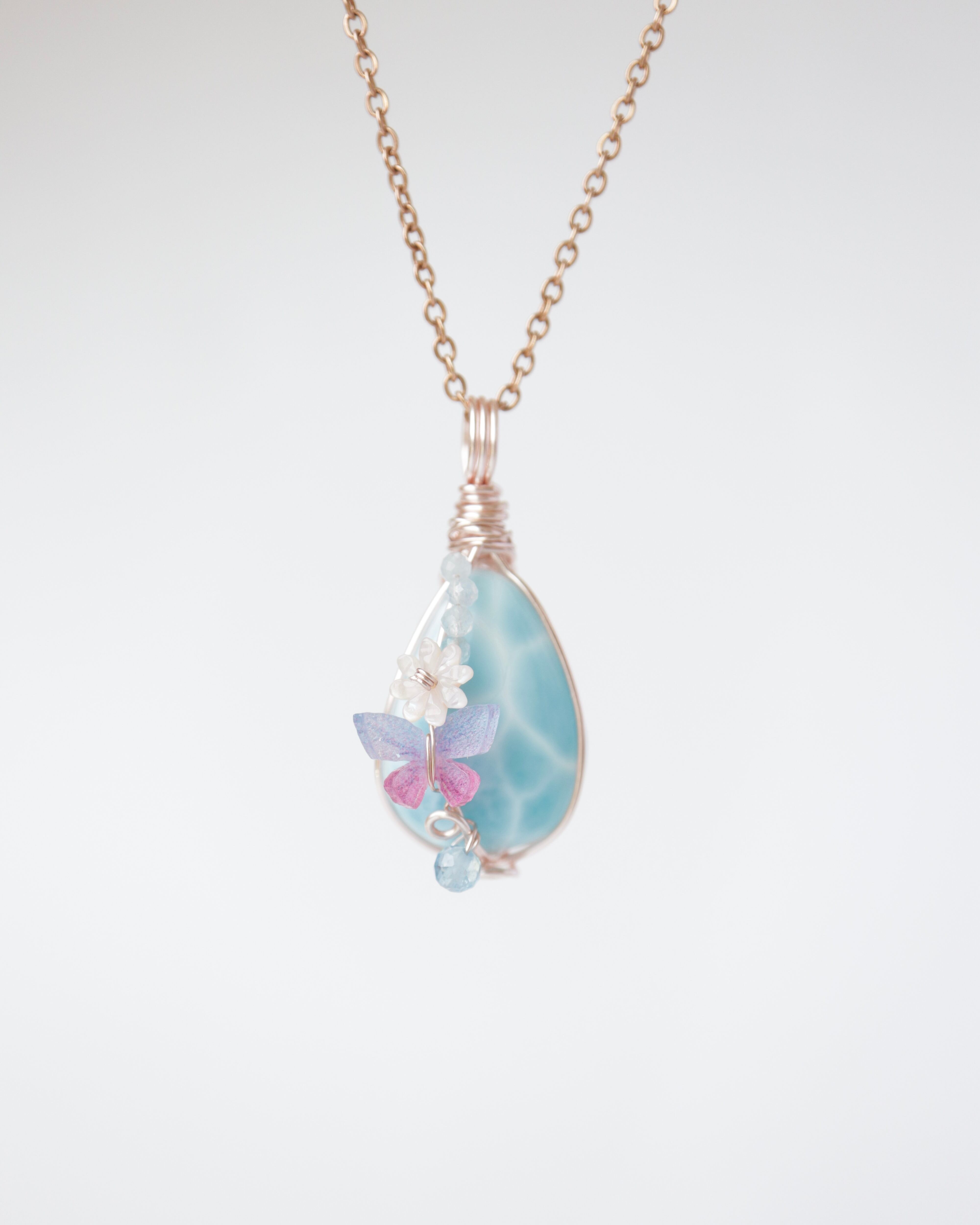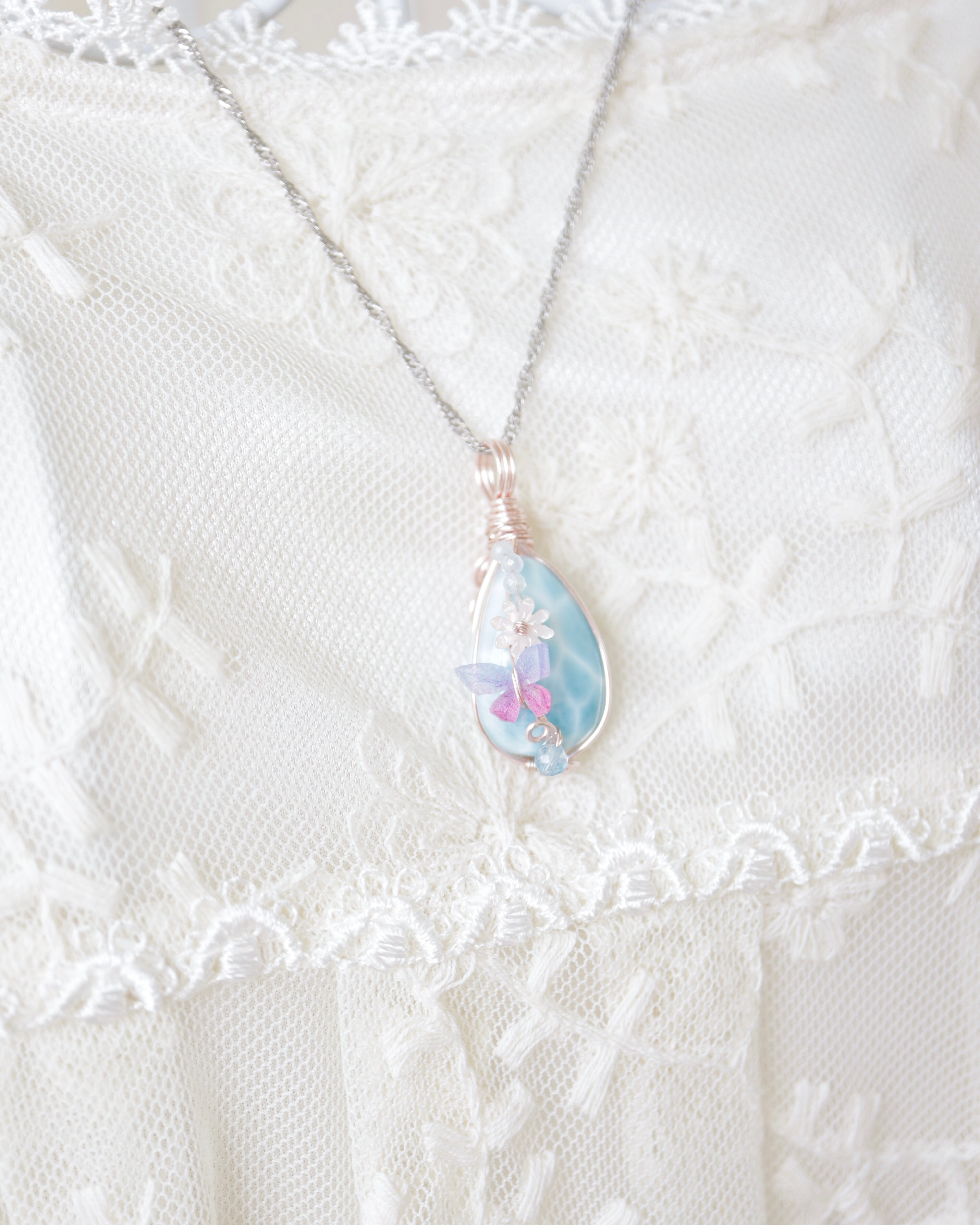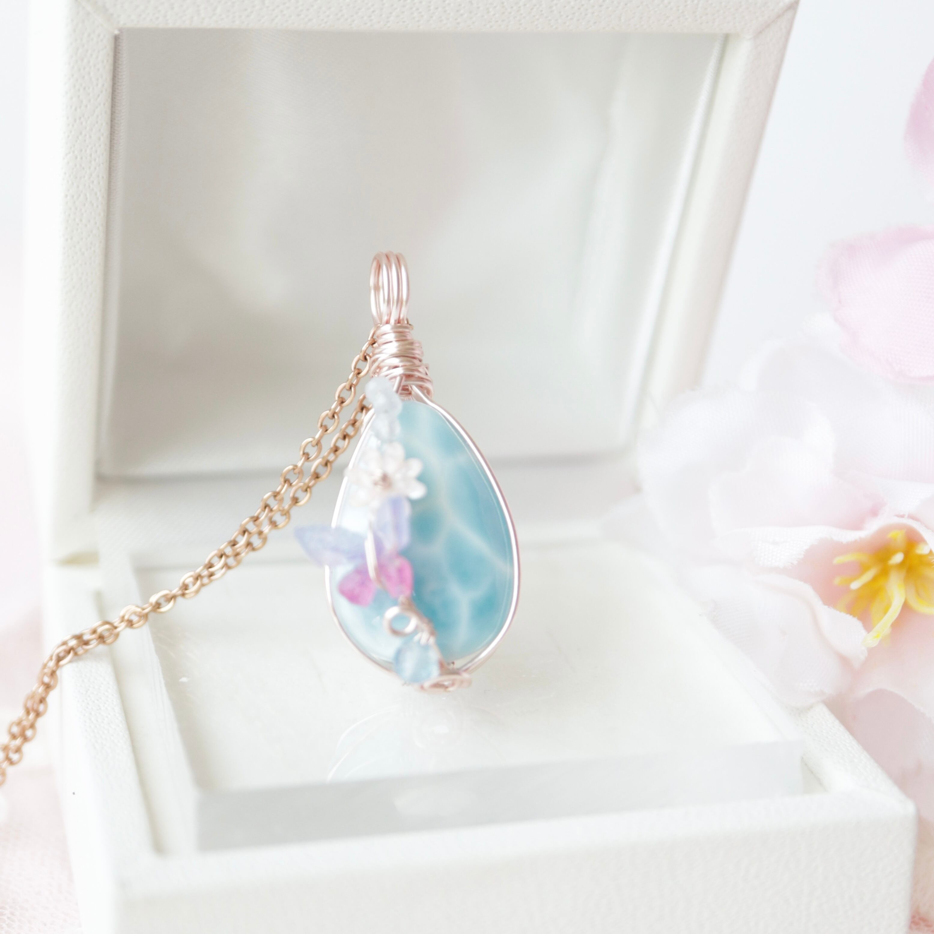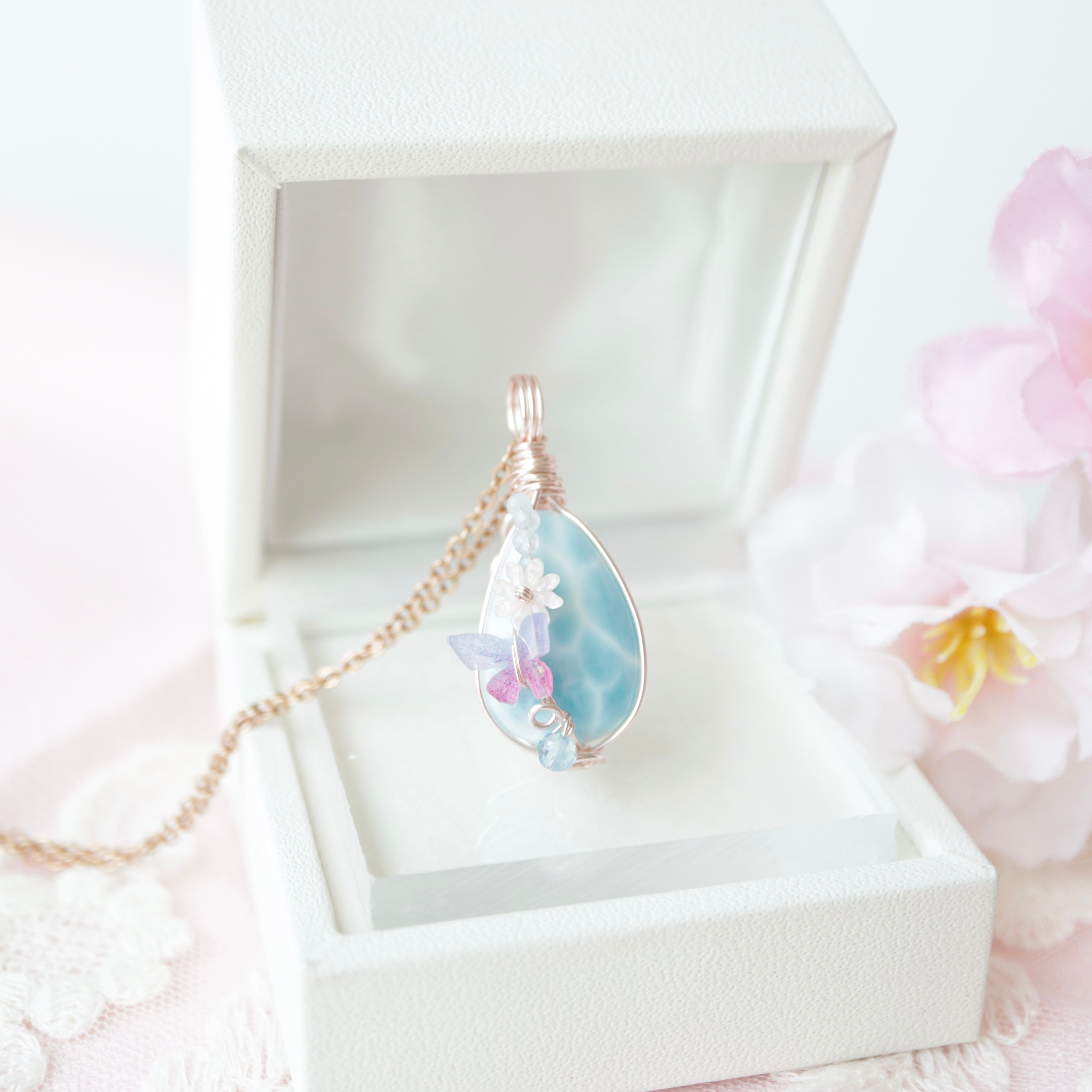 柔らかなブルーの雫の中に、春の暖かな日差しや、心地よい海風を感じていただけるような特別な世界観を表現しています。肌なじみの良いカラーのワイヤーを使用し、ラリマーそのものの美しさを引き立てつつ、可愛らしさもぎゅっと詰め込みました。