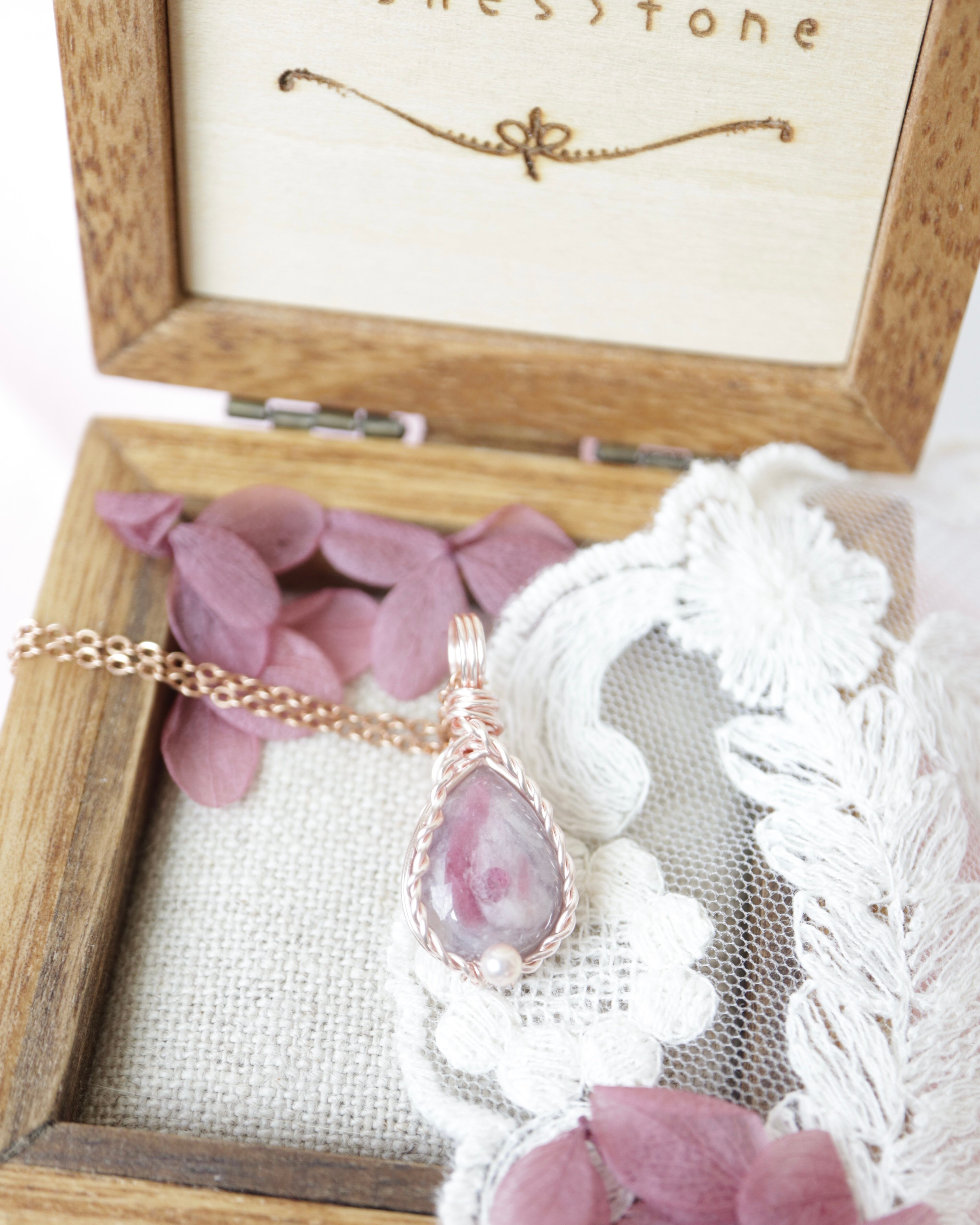 ピンク色に染まるふっくらとした雫の形と、石そのものの幻想的な雰囲気を大切に、ワイヤーのみでシンプルに仕立てました。