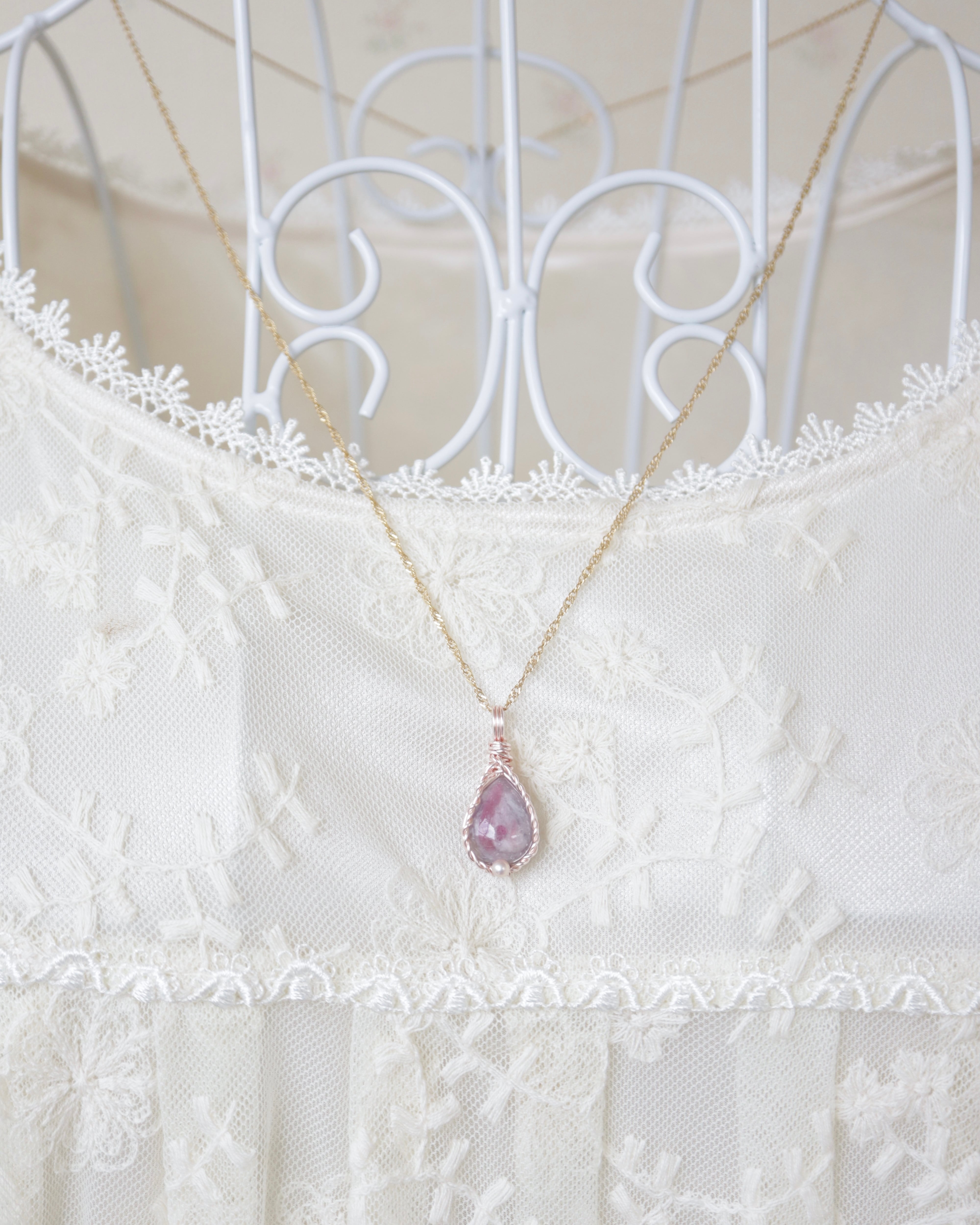 ピンクゴールドカラーのワイヤーでふんわりと包み込んだペンダントトップ。