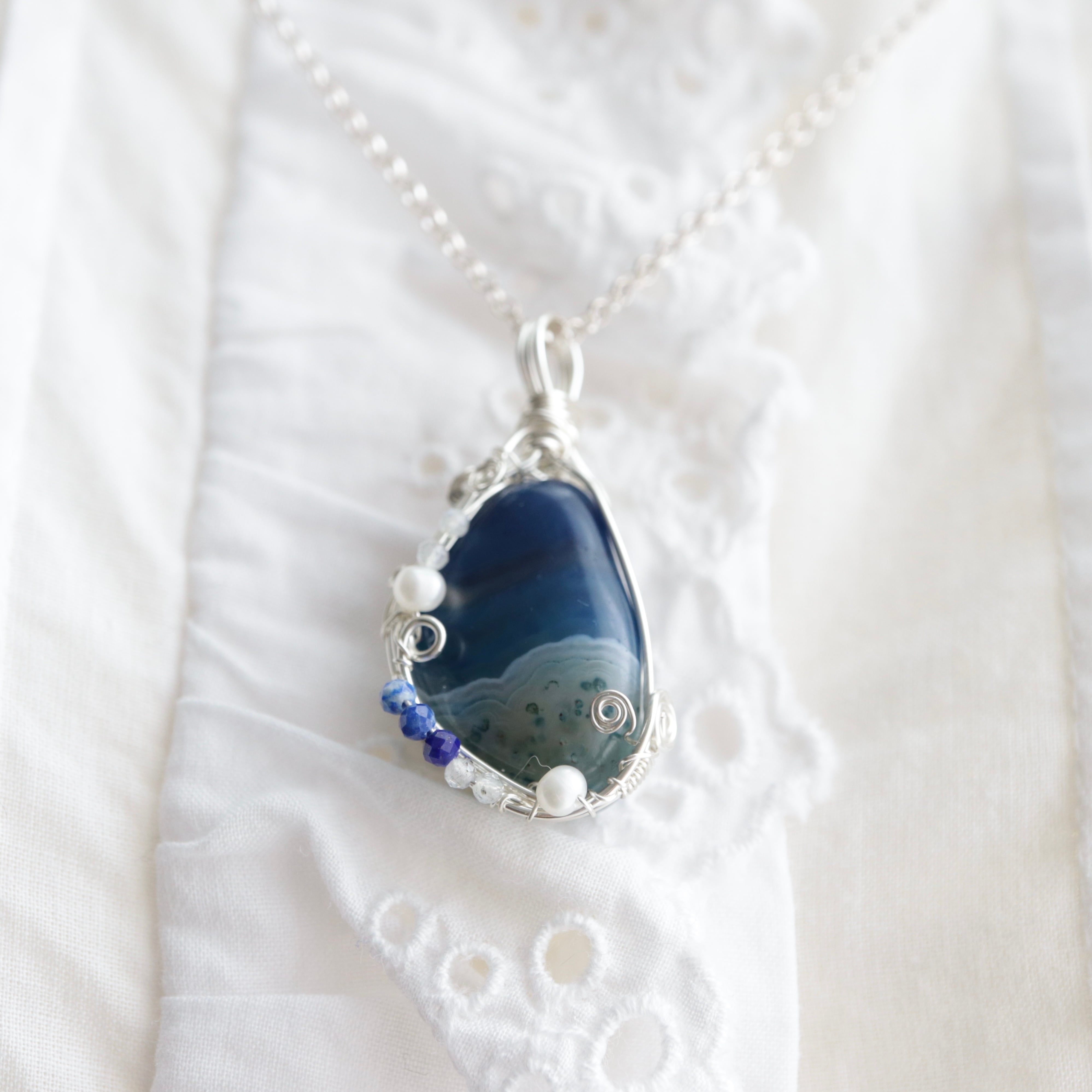 1点物 レースのような青瑪瑙 メノウ 青色しっかり ワイヤーラッピング