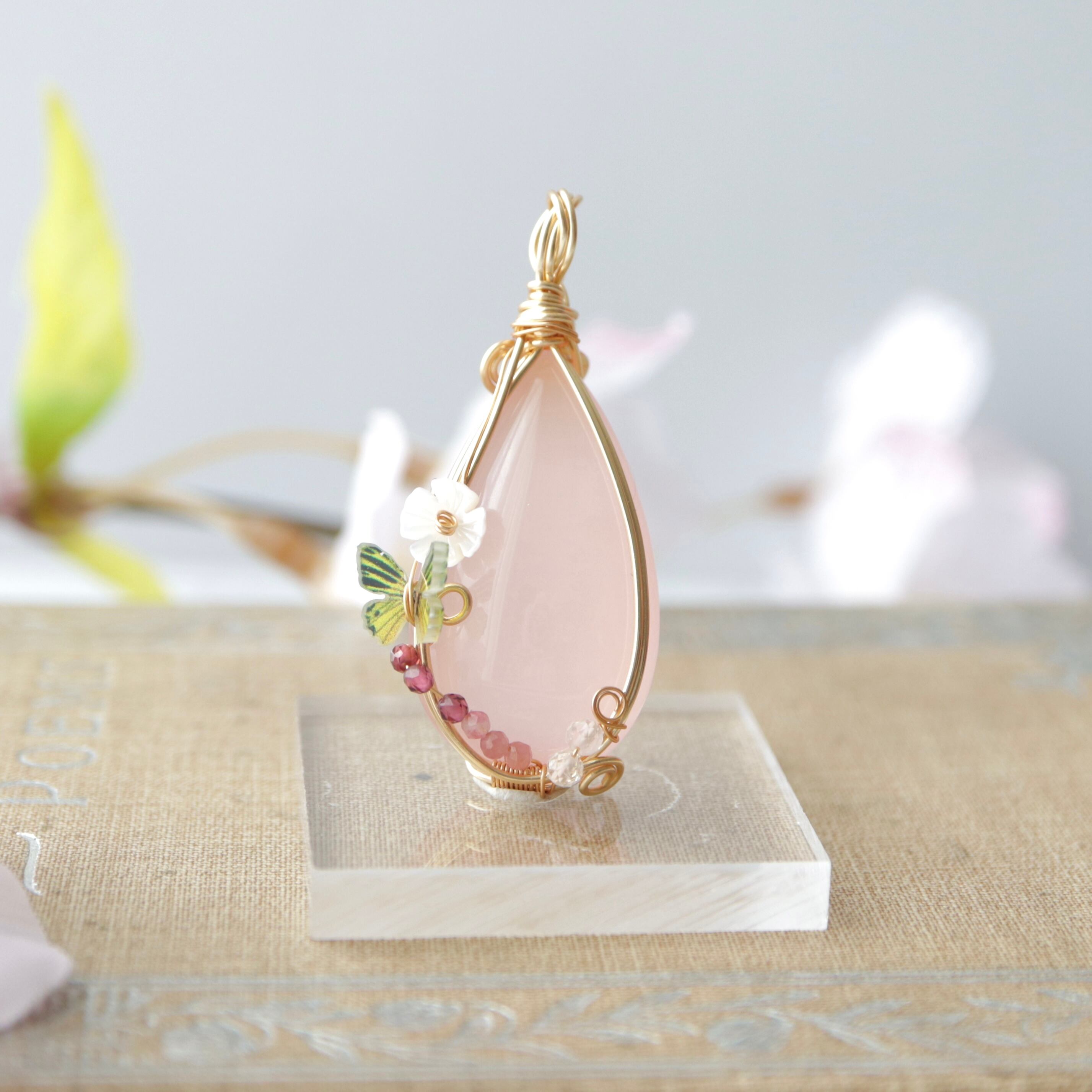 ローズクォーツのペアシェイプペンダント《花咲く恋と、ひらり蝶》|淡いピンクに恋をのせて